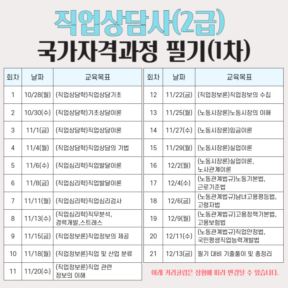 수강신청 후 중도포기자 및 미수료자, 그 외 기타의 경우 해당 기관 차기 수업의 수강 신청이 제한됩니다. 꼭 신중하게 생각해 보시고 신청해 주시기 바랍니다.